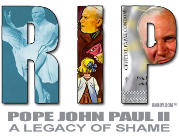 Matthew Shepard was violently gay bashed and crucified, literally tied to a wooden fence and left to die for the sin that compassionate conservatives like John Paul II and George W. Bush define as his mere existence. The Pope's recent angry tirade doesn't address how to avoid the kinds of dangerous mistakes that would result in the violent and senseless murder of Gwen Araujo, a transgendered teen or Barry Winchell. Winchell's parents, Wally and Pat Kutteles, can expect as much sympathy from the deranged and drooling drag queen in the Vatican as the children molested by his wayward priests received. All in the service of God. The unmasked face of faith-based governance.